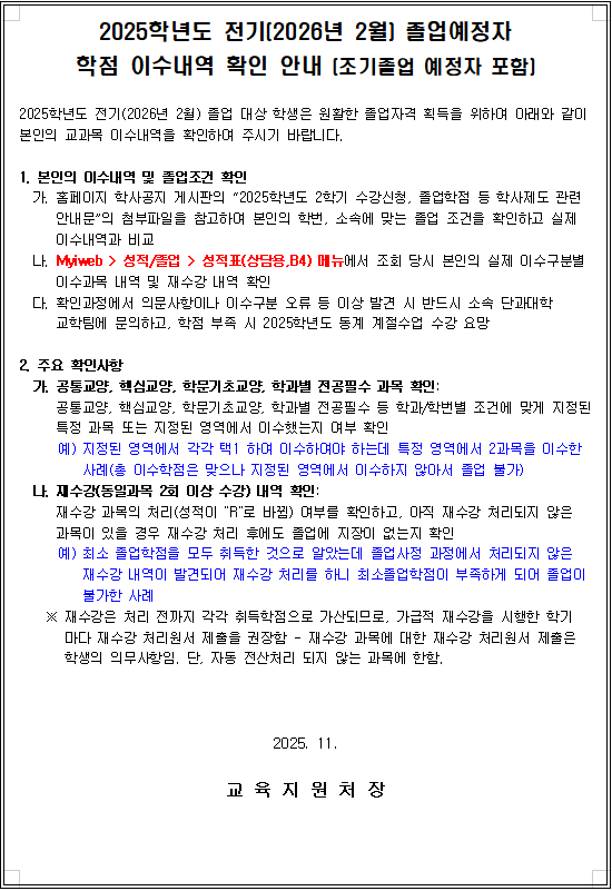 2025학년도 전기(2026년 2월) 졸업예정자인 재학생분들께선 아래의 안내문을 참고하여